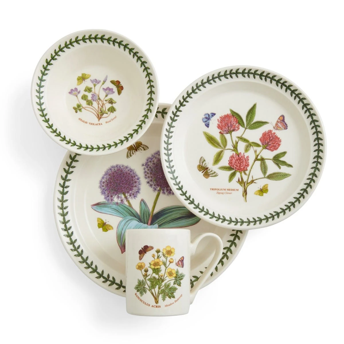 Brighten your table with the blooms of Botanic Garden and this 4 piece set. An everyday must-have for one person, this set features a dinner plate, side plate, bowl, and mug. Made in the UK, each piece is adorned with a different floral design, including a striking allium, pink clover, wood sorrel, and meadow buttercups. Their delightful appearance belies their strength and durability – every piece can be used in the microwave or oven and cleaned safely in the dishwasher. A UK online exclusive.