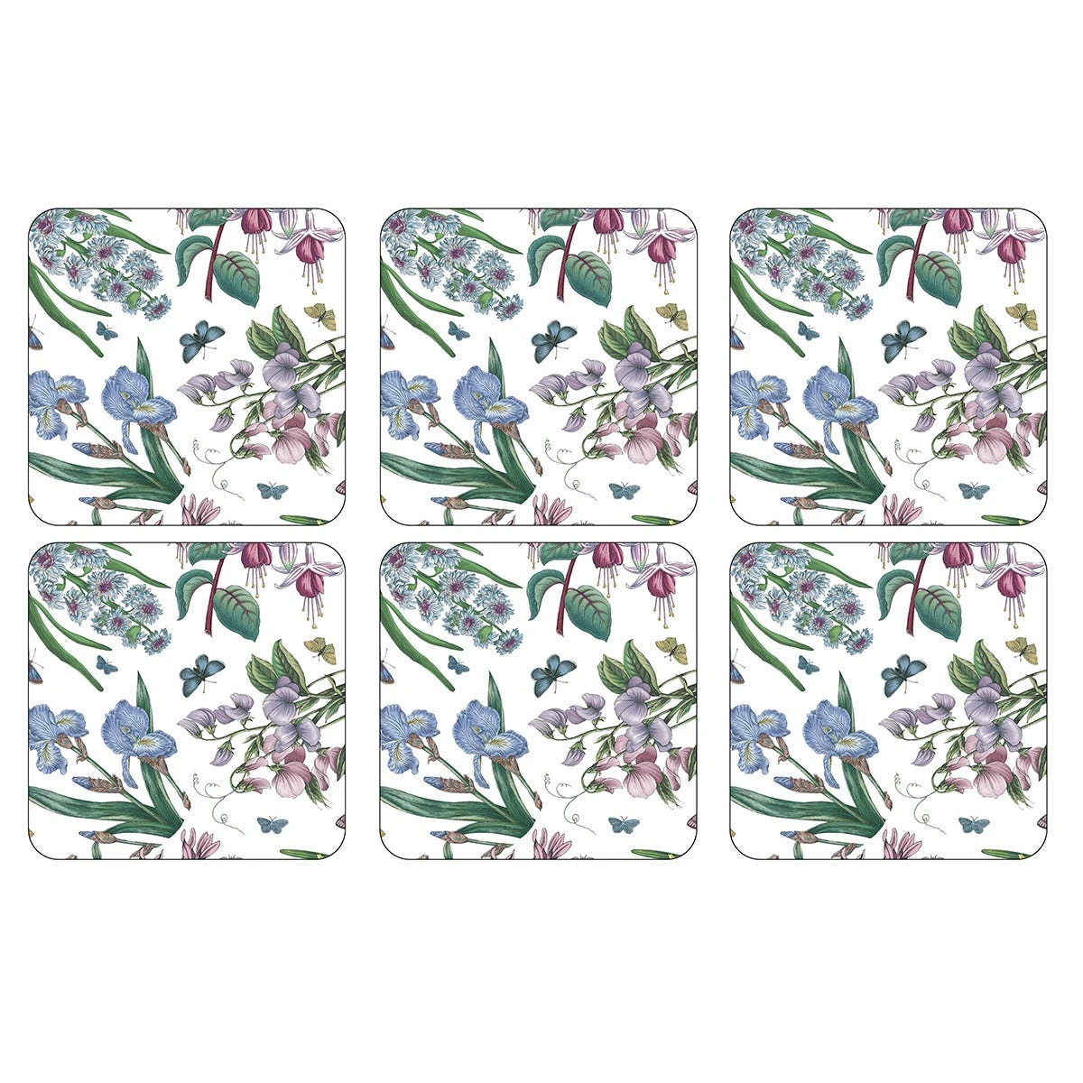 Featuring an array of beautiful floral motifs from the Botanic Garden Collection, this set of six coasters bring a pretty flower display to your table. Made from 5mm board they are totally sealed with a high quality coating that is both stain resistant and heat resistant to 100C. Each coaster is then finished with a hardwearing and insulating cork back to protect surfaces. For a wonderful Botanic Garden table setting, pair these coasters with the matching placemats for the complete look.