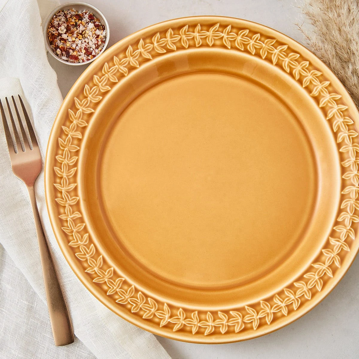 Serve up delicious food in style with this set of four Amber dinner plates made from the finest earthenware. In warm yellow they make an elegant addition to your home, and feature an embossed laurel leaf border – the signature of the classic Botanic Garden design. Lay your table with a full set of Botanic Garden Harmony or mix and match with floral Botanic Garden pieces for a family breakfast, afternoon brunch or casual dinner.