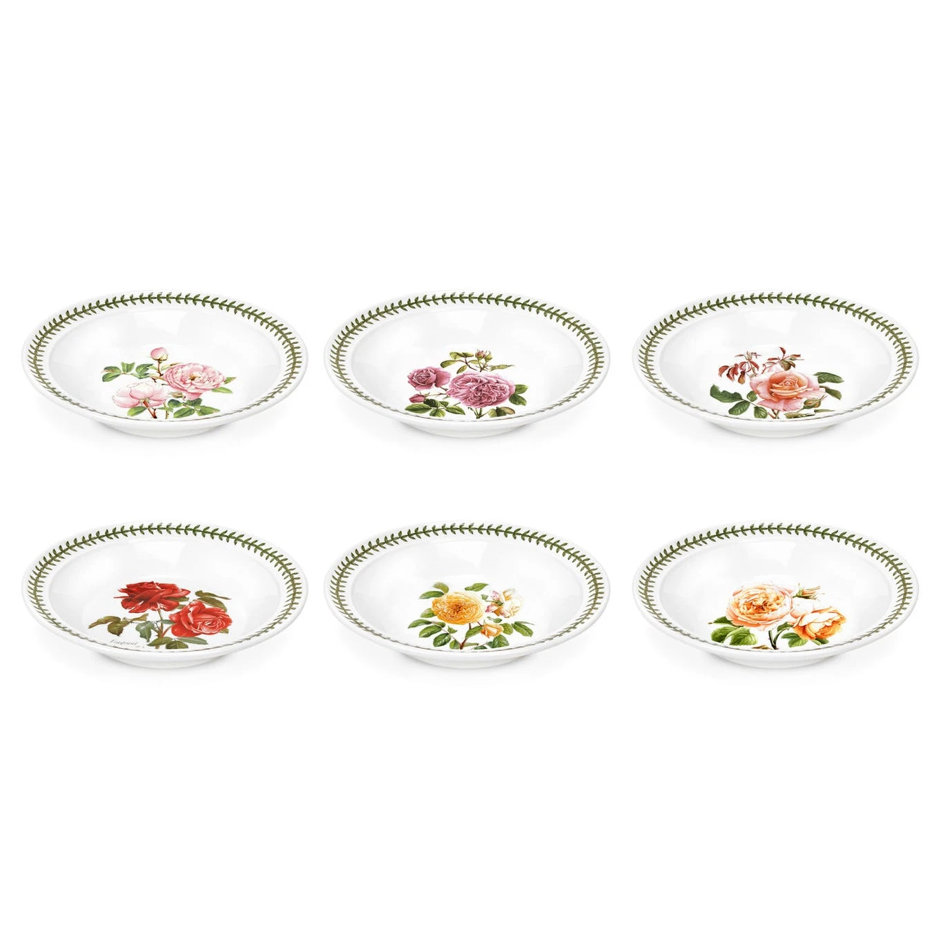 Based on Portmeirion’s famous Botanic Garden, the elegant Botanic Roses collection has been designed bring a beautiful British rose garden to your table. Full of colour, this set of six soup plates includes the Willow Grace, Teasing Georgia, Scarborough Fair, Tamora Peach, Fragrant Cloud and Portmeirion roses. The rimmed drum shape is wonderfully practical and displays the beautiful laurel leaves edging perfectly. Made for the busy kitchen, these soup plates are dishwasher and microwave safe.