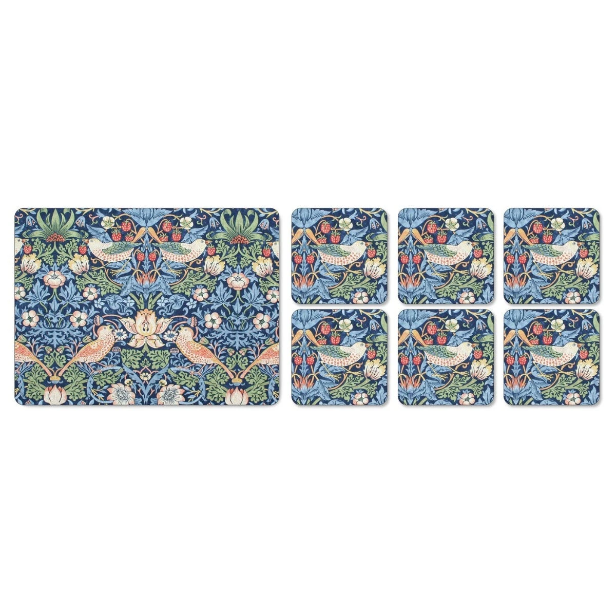 A wonderful collection to provide the style for any dining occasion, this set of six placemats and six matching coasters feature the beautiful Morris & Co. Strawberry Thief design in blue. Made to protect your precious furniture, these placemats and coasters are sealed with a coating that is both stain and heat resistant up to 100C. Wonderfully coloured and detailed, this set of placemats and coaster make a lovely addition to your home.