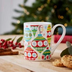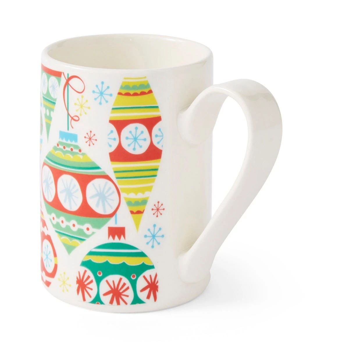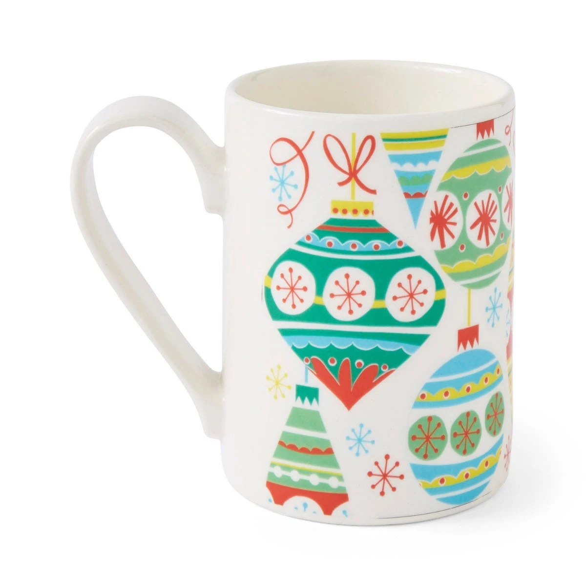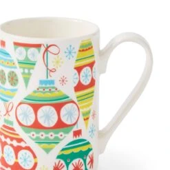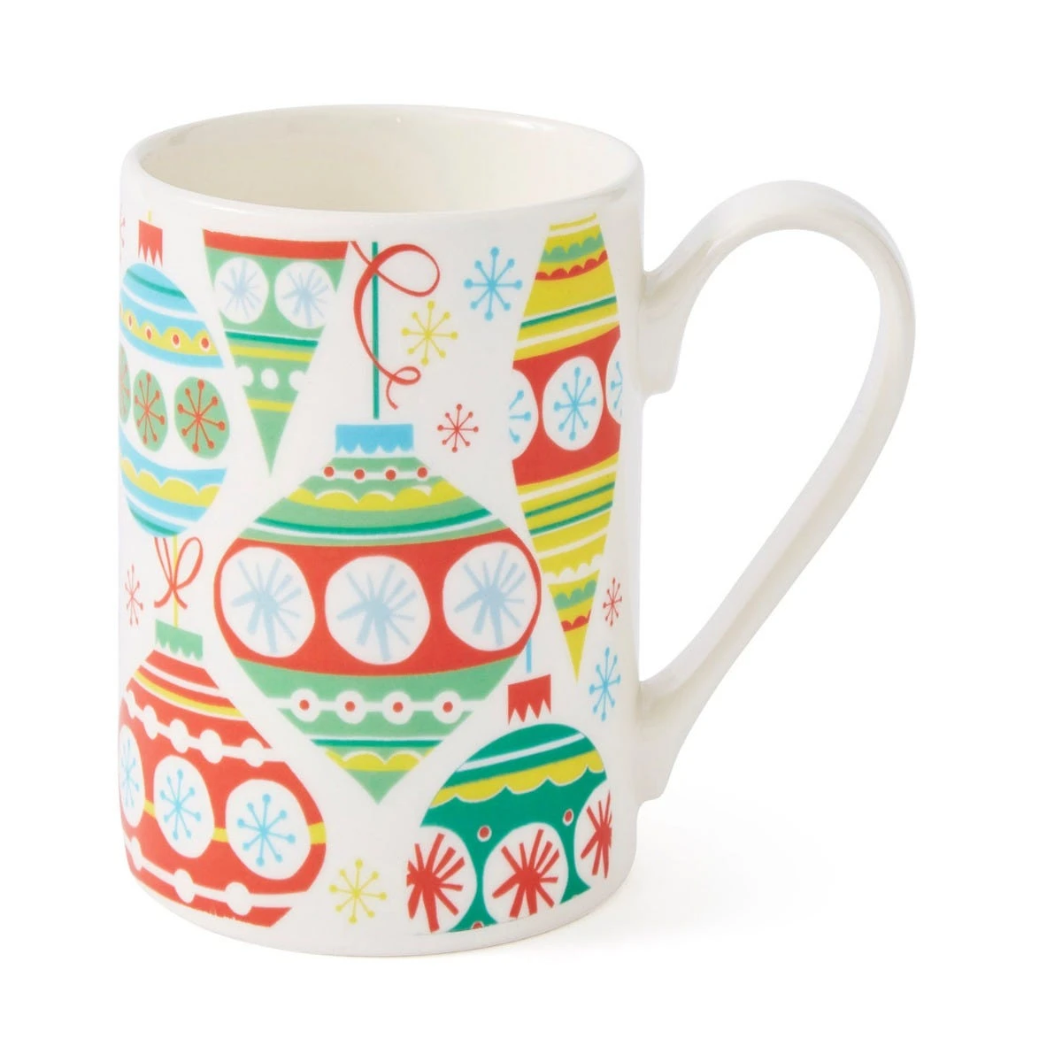 Bring a retro twist to your Christmas with this colourful mug featuring vintage-shaped baubles in shades of yellow, red and green. Colourful and fun, this tall mug is a wonderful addition to your Christmas décor and makes a perfect gift for someone special too. Made in the UK from the finest earthenware, you can use this durable mug every day, heating up drinks in the microwave and popping it in the dishwasher for cleaning after use.