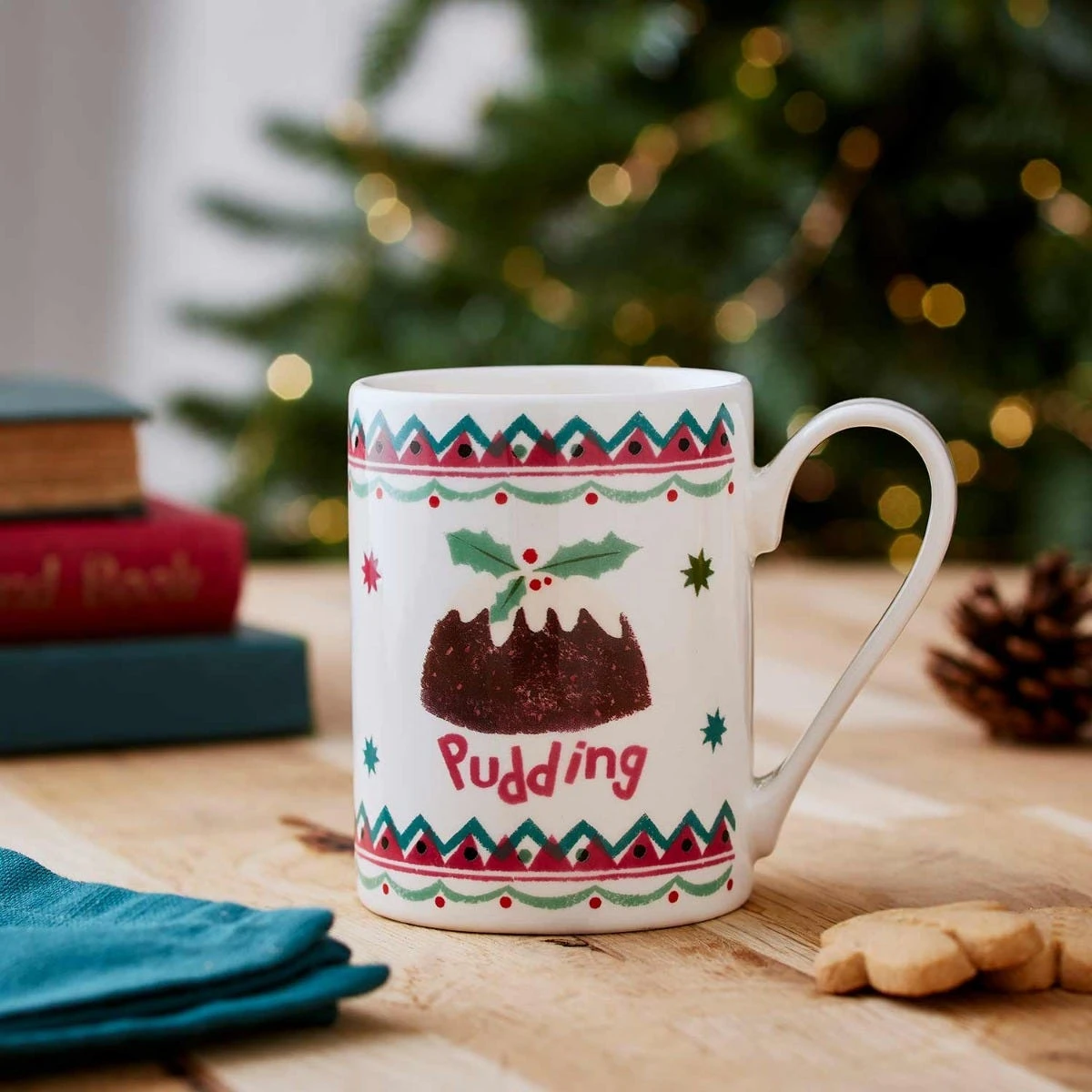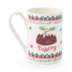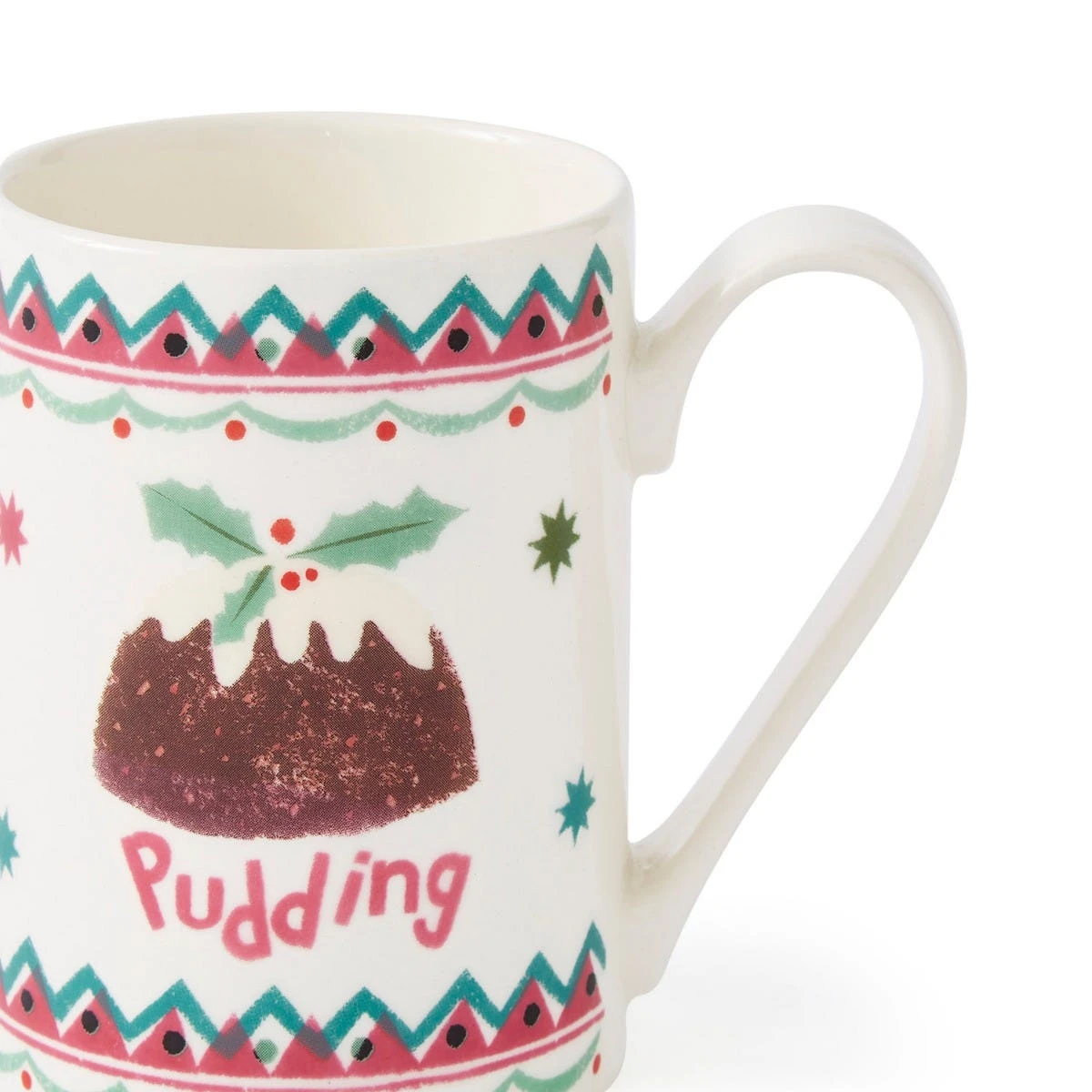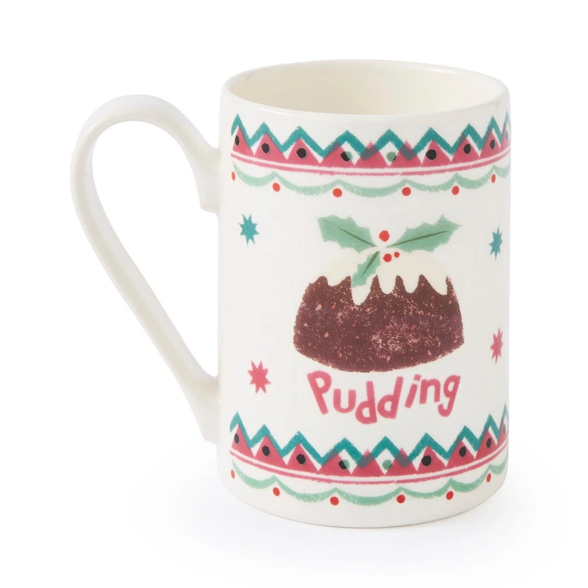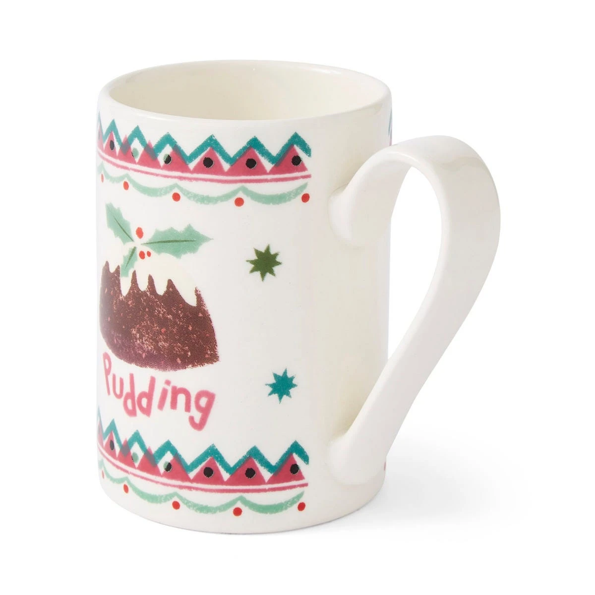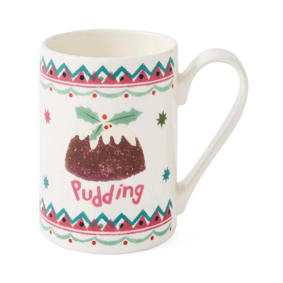 Oh, bring us a figgy pudding and a good cup of cheer! Wish someone a very merry Christmas with this festive mug, featuring a holly-topped pudding surrounded by colourful geometric details in shades of pink and green. Designed and made in the UK, this earthenware mug is perfect for enjoying tea, coffee, and festive hot chocolate throughout winter. Dishwasher safe, this mug can be easily cleaned ready for the next time you want to use it.