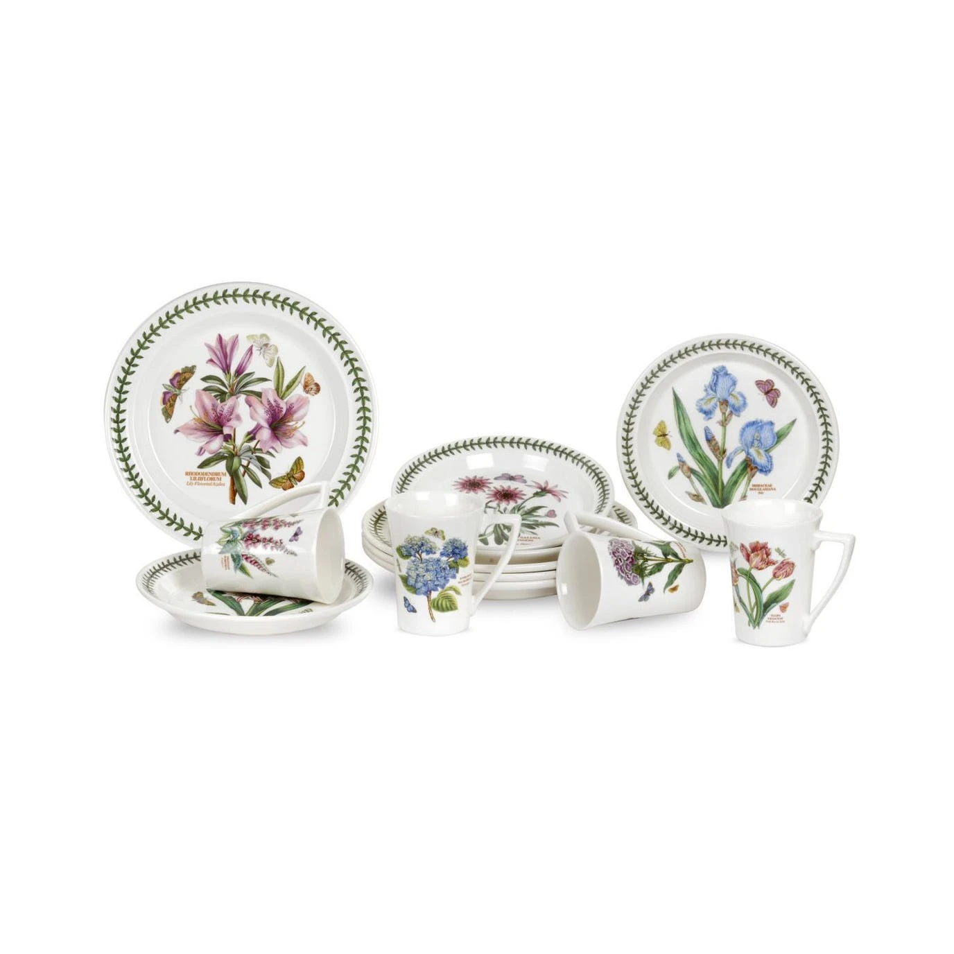 This item is made in Stoke-on-Trent, England. The set include four of each 10 Inch plates- each with a different flower design- each with a different flower design and mandarin shaped mugs- each with a different flower design .