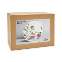 Bring the beauty of the outdoors to your table with this 16-piece porcelain set from Portmeirion Home. Featuring four of each dinner plates, side plates, cereal bowls, and mugs, each piece is adorned with an intricate pink rose design, colourful butterflies and a soft green border. The crisp, white background of each piece showcases the delicate pattern in a beautiful style. Dishwasher and microwave safe, this set can be used every day for your family breakfasts, lunches and dinners.