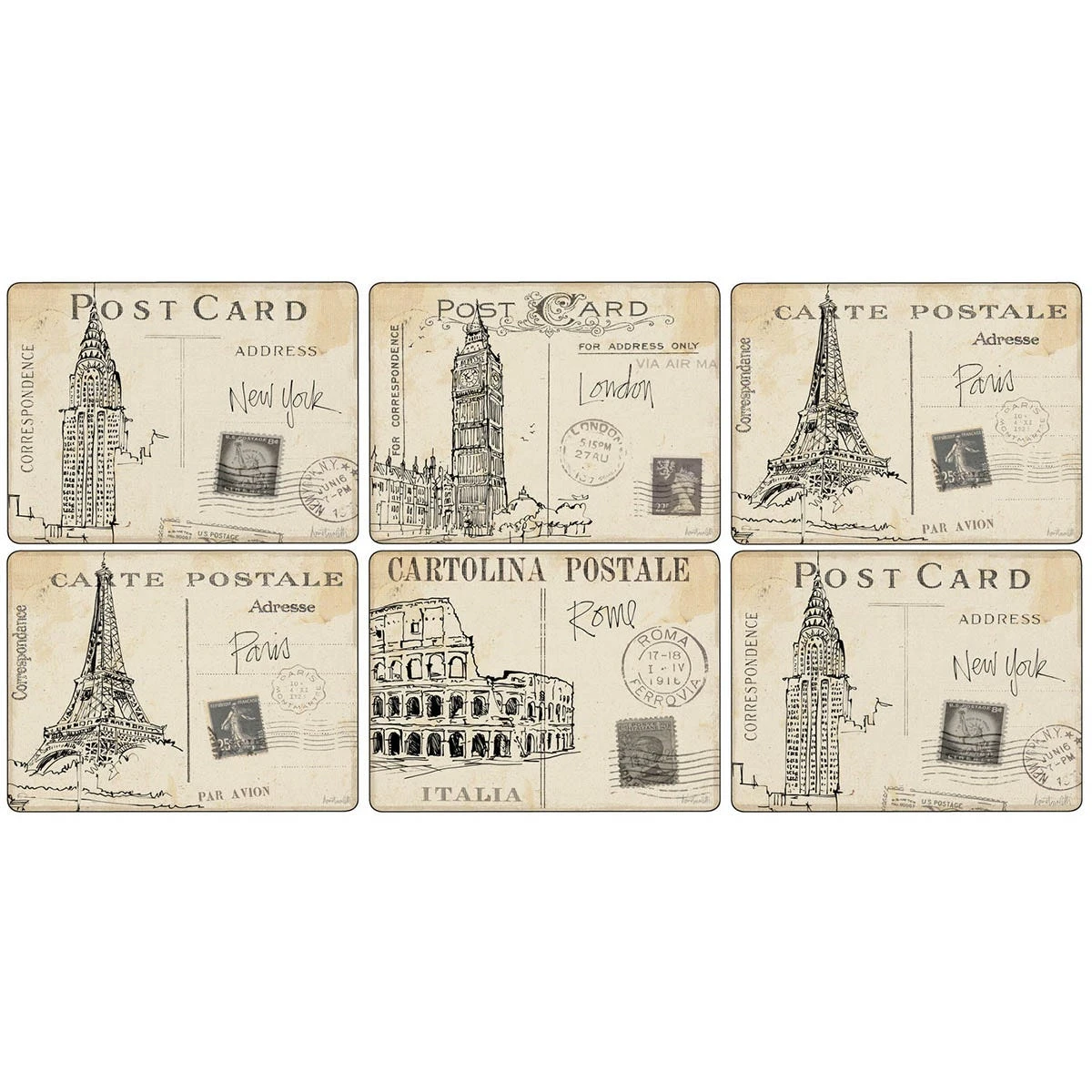 Capture the excitement of travel with this set of six placemats featuring postcard style sketches of iconic landmarks. Made from 5mm board, they are totally sealed with a high quality coating that is both stain resistant and heat resistant to 100C. Each placemat is then finished with a hardwearing and insulating cork back to protect surfaces. Matching coasters and larger size placements are available for a complete table setting.