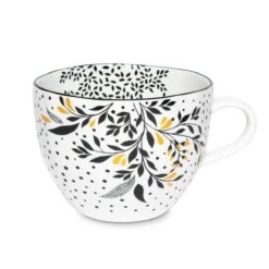Sit back and relax in style with this gorgeous Artisanne Noir Bohemia mug from Sara Miller London. Featuring trailing leaves against a spotty background in striking shades of monochrome, delicate touches of gold add precious detailing to this must-have mug. The soft curves of the mug’s body and handle make cradling your favourite hot drink a moment to savour. Made from porcelain, this mug can be placed in the dishwasher after use – the perfect addition to your cup collection.