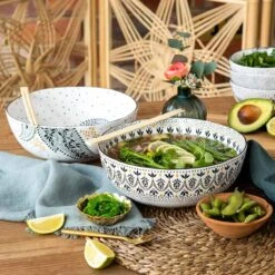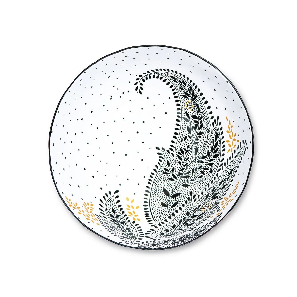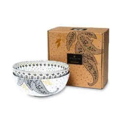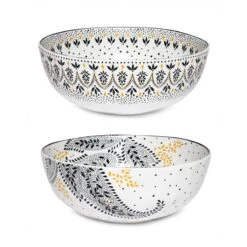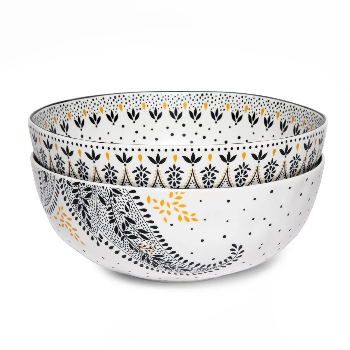 A set of 2, these large bowls from the Artisanne Noir collection feature two mix-and-match monochrome designs, Mandala and Paisley, that wrap elegantly around the soft curves of each piece. Perfect for serving noodles, hearty pasta dishes, and soups, these porcelain bowls are an irresistible addition to your collection. Embellished with gold detailing, but microwave and dishwasher-safe, this bowl set is both beautiful and practical. Packaged in a matching designed box, these bowls make a wonderful housewarming gift.