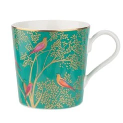 With pink and gold birds set against an emerald green backdrop, this Sara Miller London Portmeirion mug is simply divine. Accented with 22 carat gold details that shimmer as they catch the light, this mug is the ultimate addition to morning coffees and restful tea breaks. The mug itself is made from fine china and is a joy to hold and drink from. Given as a gift in its stunning foil pressed gift box, it is sure to delight.