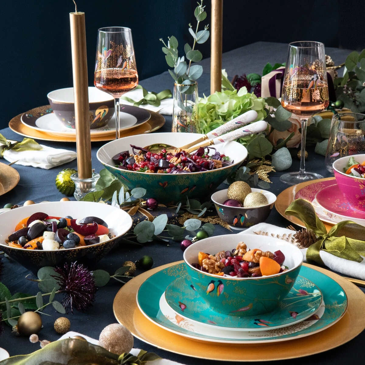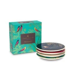 This vibrant set of coasters from Sara Miller London is a statement-making addition to your home. In irresistible shades of pink, green, blue, and grey, these fine china coasters feature glistening 22-carat gold detailing amongst an elegant design of hummingbirds and blossom trees. Use for everyday drinking or dining occasions, keeping surfaces free from unwanted marks. Presented in a beautiful gift box, this coaster set makes for a wonderful gift for a loved one who appreciates a touch of sparkle.