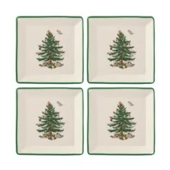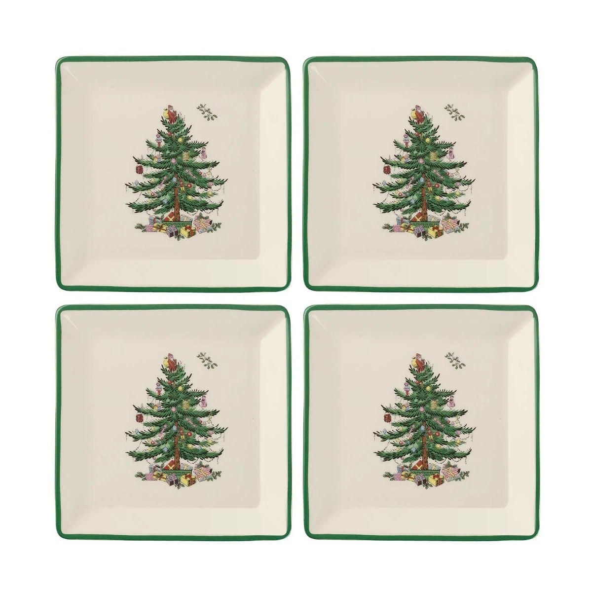 This set of 4 square plates add a touch of seasonal cheer when serving dips or snacks to your guests this Christmas. Part of our Christmas Tree collection, the dishes feature our beloved tree design and a green trim. They make for a delightful addition to the dinner table and can be cleared away without a fuss being dishwasher safe.