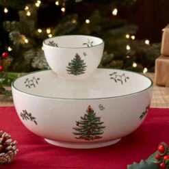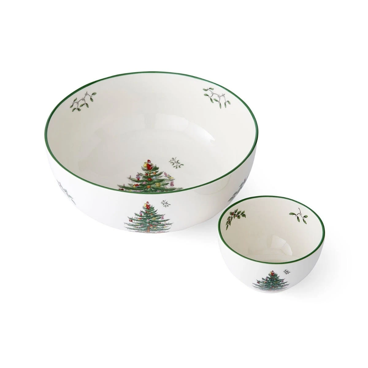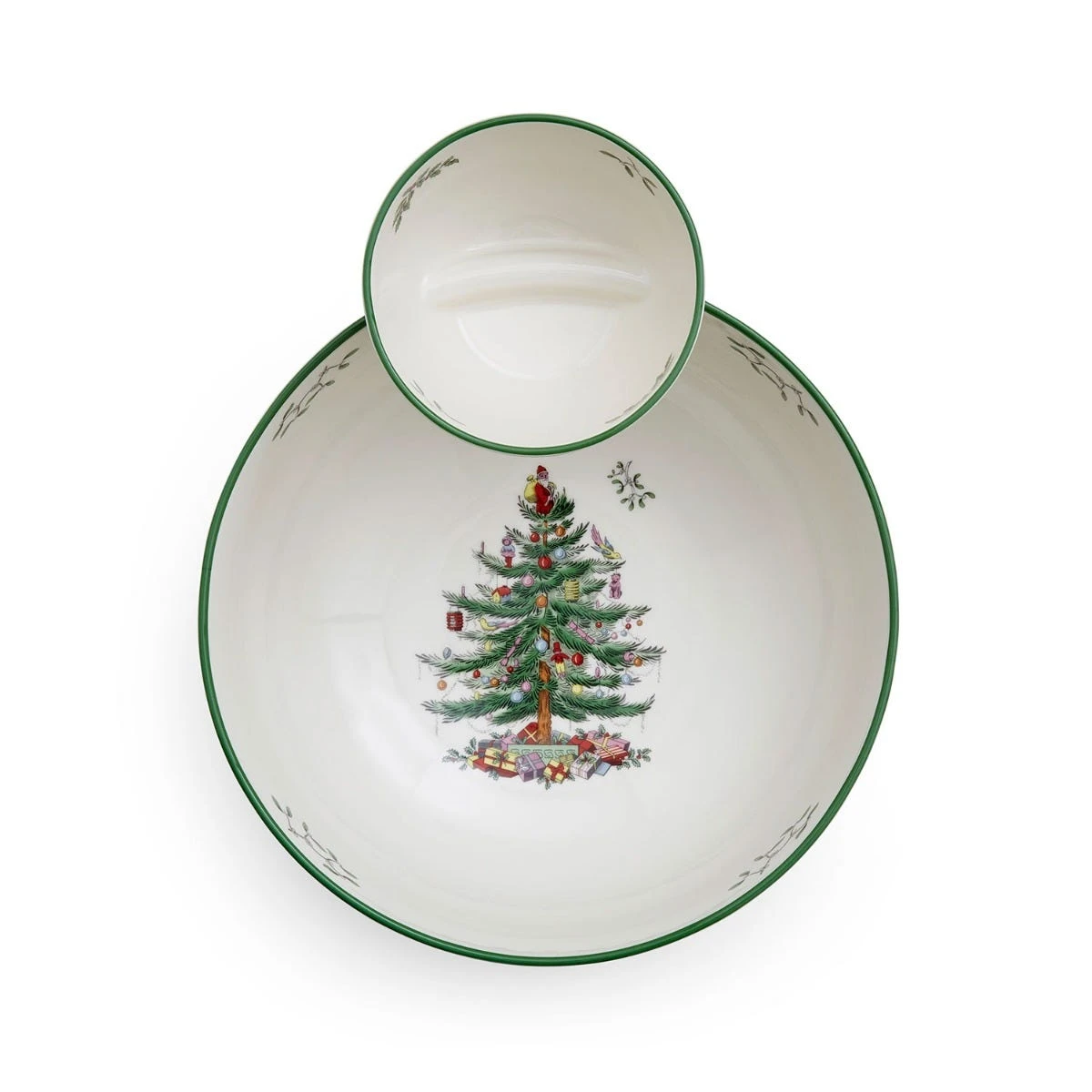 Bring joy to your Christmas get-togethers with this delightfully festive Chip n Dip. A wonderful versatile piece, fill the larger bowl with nachos, bread, or an array of vegetables or fruit, then simply add your dip of choice, whether sweet or savoury, to the smaller bowl and stack on the side. Used together or apart, this chip n dip makes feeding a crowd a treat. Featuring the iconic Spode Christmas Tree design on both pieces, this porcelain set is a must-have for your seasonal celebrations.