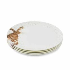 Introduce the beauty of the great outdoors to your dinner table with this set of four Wrendale Designs coupe plates. Each one features a fluffy hare peering out from the side, and the collectionโs signature speckles of colour sit around the rim. Use these plates every day or for creating a charming setting at parties. Preparing dishes ahead of time is easy as they are microwave, freezer and oven safe, and can be popped in the dishwasher at the end of the evening.